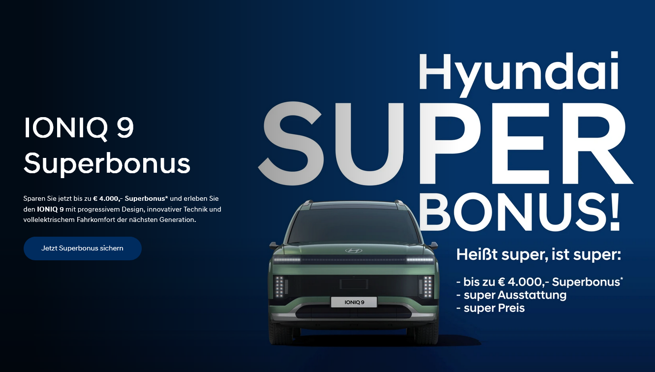 Der neue Hyundai IONIQ 9 ist als 6- oder 7 Sitzer erhältlich und bietet ein großzügiges Raumkonzept und hohen Fahrkomfort. Aerodynamisches Design, moderne Technologien und umfassende Sicherheitsfunktionen machen ihn zum starken First-Class-SUV. Hier finden Sie alle Infos rund um den IONIQ 9.